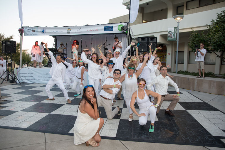 The manicured lawn of the Canada College campus was a wonderful place to host Picnic en Blanc. In 2017, the Foundation commissioned a public art piece, Redwood City Pages, and the Artist/Photographer Brian Taylor created a cyanotype piece with the help of guests that was incorporated into the final public art piece. For the first time at Picnic en Blanc, guests were treated to a flashmob of dancers who appropriately set the mood for the dance party. The Peelers, a Top 40 mashup and medleys cover band, kept everyone on their feet and dancing throughout the duration of the event.